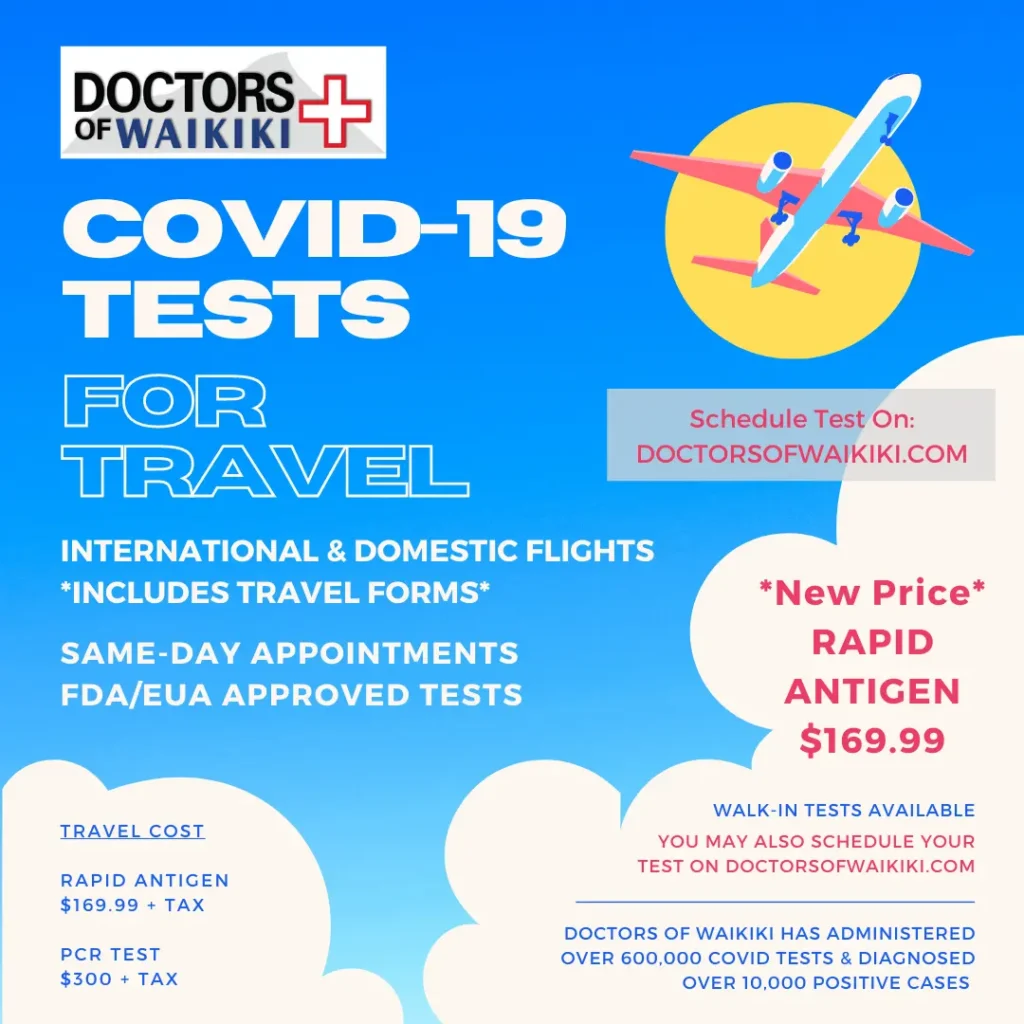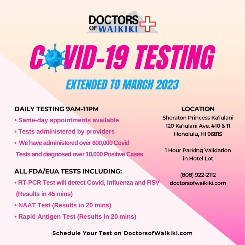 Doctors of Waikiki is now offering in-clinic FDA/EUA approved tests for COVID-19 Testing from 9:00 am to 11:00 pm (Daily). *Required to provide ID and proof of insurance. Testing, testing, testing, and public support is important on our road to recovery for the State of Hawaii.